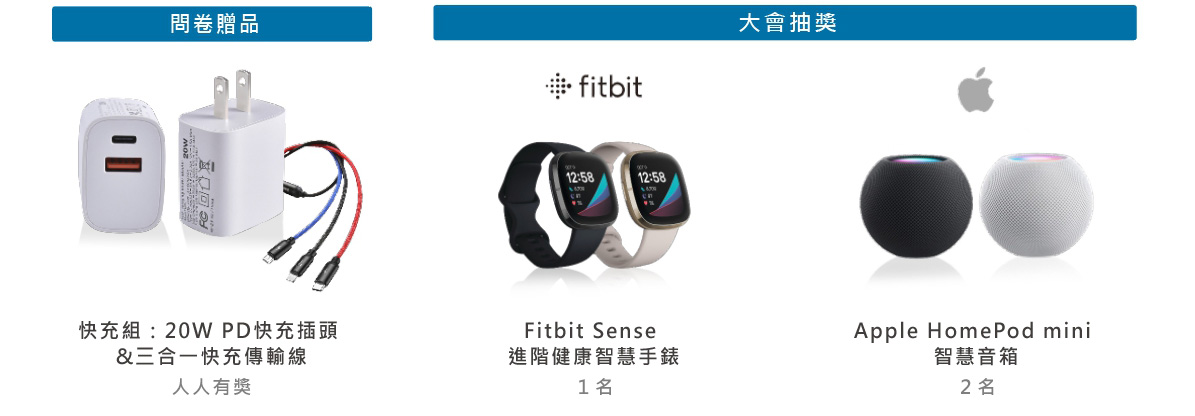 連續兩天,全程參加線上直播並成功填寫問券,就可以獲得快充組一組;還有機會抽中 Fitbit Sense 智慧手錶及 Apple HomePod mini !