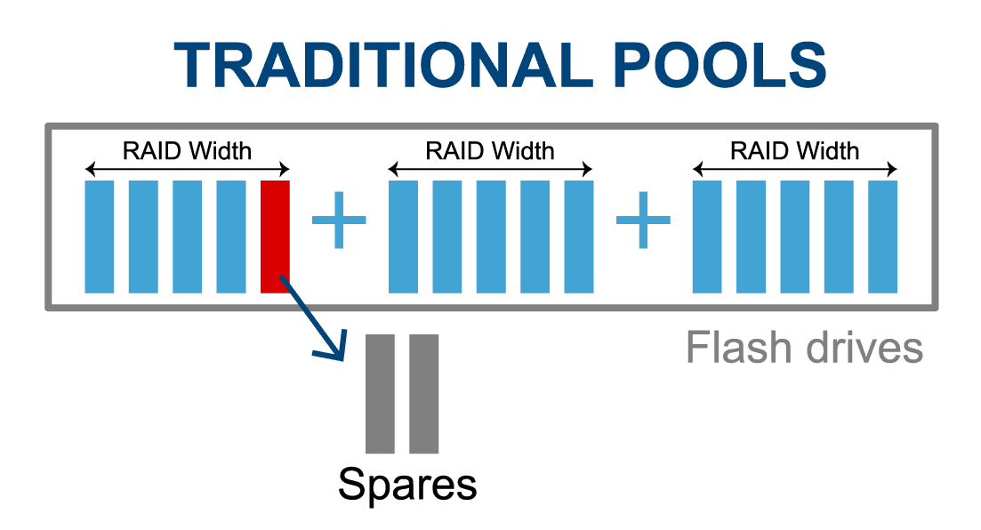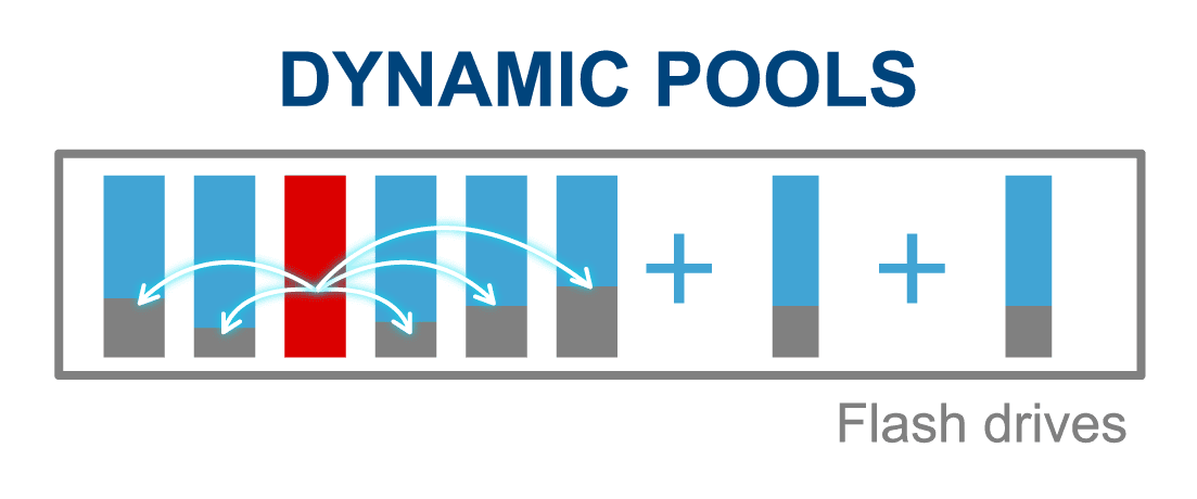動態儲存池(Dynamic Pools)擁有嶄新的儲存容錯架構,傳統 RAID 模式的擴充需要整組進行擴充,增加許多不必要的空間和成本浪費。但 Dynamic Pools 打破儲存硬碟等量擴充的限制,可依實際需求進行硬碟置換,提升資源使用率、降低成本。
